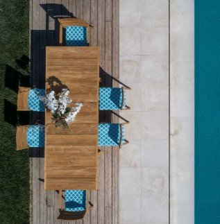 Il nostro tavolo in teak è perfetto per coloro che desiderano un’opzione versatile per i loro spazi esterni. Realizzato in pregiato teak con finitura spazzolata, questo tavolo offre una combinazione di stile e funzionalità.